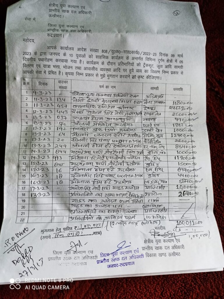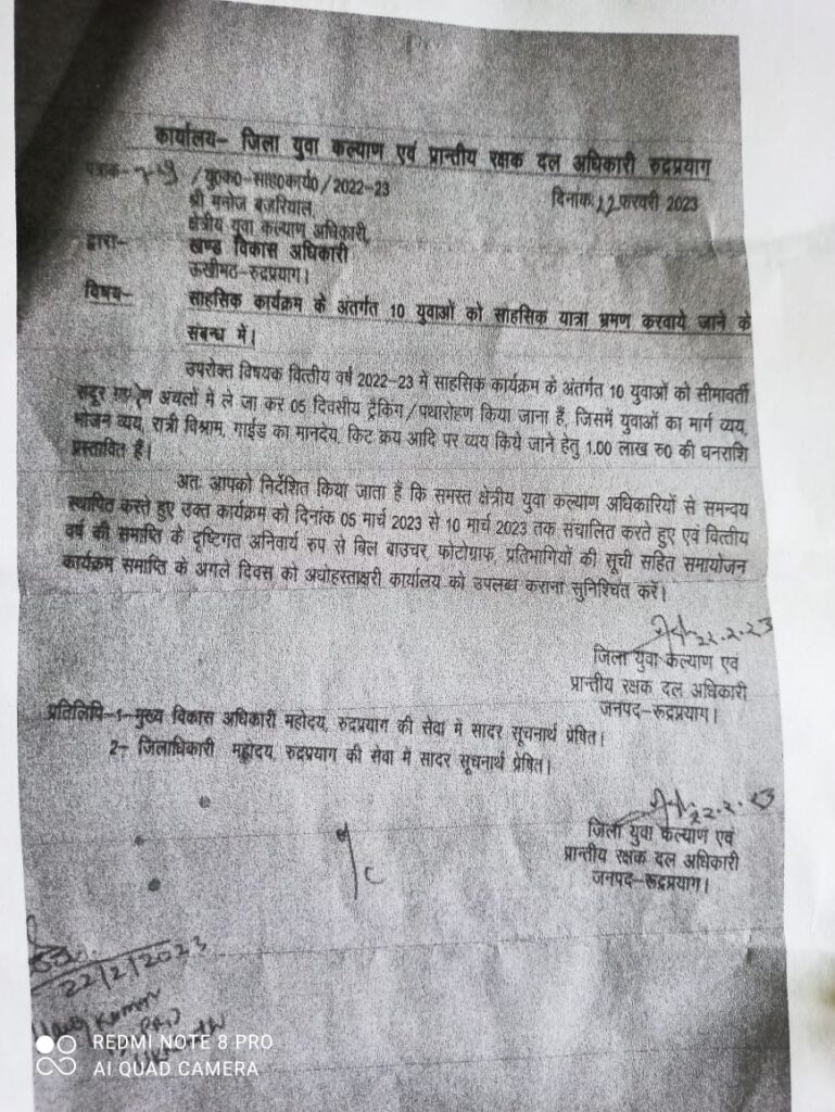 रुद्रप्रयाग:क्षेत्रीय युवा कल्याण एवं प्रान्तीय रक्षक दल के तत्वावधान में विगत मार्च माह में संपन्न हुए पांच दिवसीय साहसिक यात्रा भ्रमण में हजारों रूपये वारा- न्यारा होने का मामला प्रकाश में आया है। साहसिक यात्रा भ्रमण में शामिल युवाओं के अनुसार पांच दिवसीय साहसिक यात्रा भ्रमण को तीन दिनों में संपन्न कराने से विभाग की कार्यप्रणाली सवालों के घेरे में आ गयी है। विभागीय मानकों के अनुसार साहसिक यात्रा भ्रमण में तीनों विकासखण्ड के युवाओं को शामिल किया जाना था मगर विभाग द्वारा विकासखण्ड जखोली के तीन व विकासखण्ड ऊखीमठ के सात युवाओं को भ्रमण में शामिल कर विकासखण्ड अगस्तमुनि के युवाओं की अनदेखी करना न्यौचित नहीं लग रहा है। सूचना अधिकार अधिनियम से मिली जानकारी के अनुसार जिला युवा कल्याण एंव प्रान्तीय रक्षक दल अधिकारी ने 22 फरवरी 2023 को पत्राक संख्या 713 के माध्यम से क्षेत्रीय युवा कल्याण एवं प्रान्तीय रक्षक दल अधिकारी को पत्र भेजकर साहसिक यात्रा भ्रमण के तहत तीनों विकासखण्डों के 10 युवाओं को सीमावर्ती सुदूर अंचलों में ले जाकर 5 दिवसीय ट्रैकिंग / पथारोहण के निर्देश दिये गये थे तथा साहसिक यात्रा भ्रमण पर एक लाख रुपये व्यय किये जाने थे।