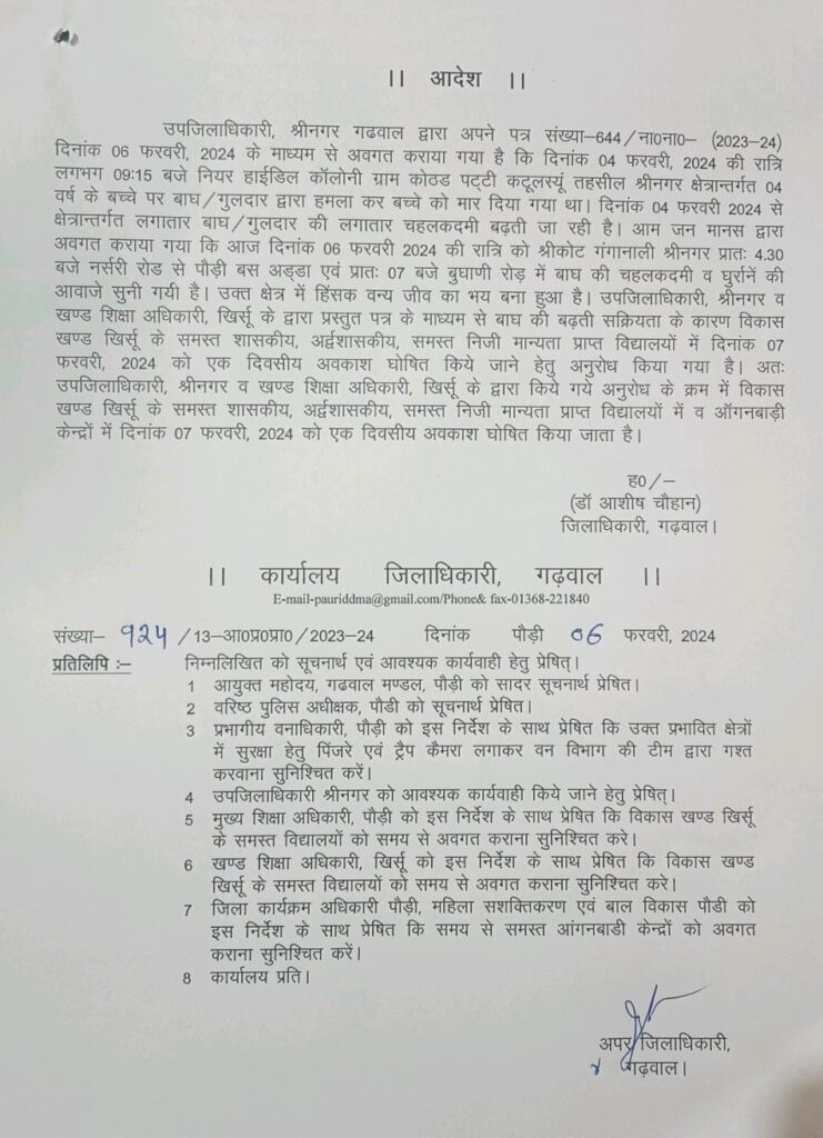 साथ ही जिलाधिकारी डॉ आशीष चौहान ने गुलदार की चहलकदमी को देखते हुए खिर्सू ब्लॉक के समस्त शासकीय, अर्द्धशासकीय, समस्त निजी मान्यता प्राप्त विद्यालयों व आँगनबाड़ी केंद्रों में आज(बुधवार)7फरवरी को एक दिवसीय अवकाश घोषित किया है।