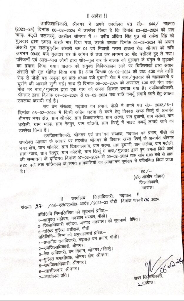 श्रीनगर। विकासखंड खिर्सू के अंतर्गत श्रीनगर, ग्वाड़ , रैतगांव, श्रीकोट आदि गांवों में गुलदार की गतिविधियों को देखते हुए प्रशासन ने दो दिवसीय रात्रि कर्फ्यू लगाया है। गुलदार के आतंक को देखते हुए उपजिलाधिकारी श्रीनगर नुपूर वर्मा और उप वन संरक्षक गढ़वाल वन प्रभाग की ओर से प्रस्तुत की गई आख्या के आधार पर तहसील श्रीनगर के विकास खण्ड खिर्सू के अन्तर्गत श्रीनगर नगर क्षेत्र, ग्राम श्रीकोट, ग्राम ढिकवालगांव, ग्राम सरणा, ग्राम बुघाणी, ग्राम जलेथा, ग्राम मटोली, ग्राम ग्वाड, ग्राम रैतपुर, ग्राम कोठगी, ग्राम खिर्सू में बाघ गुलदार द्वारा पुनः हमला किये जाने