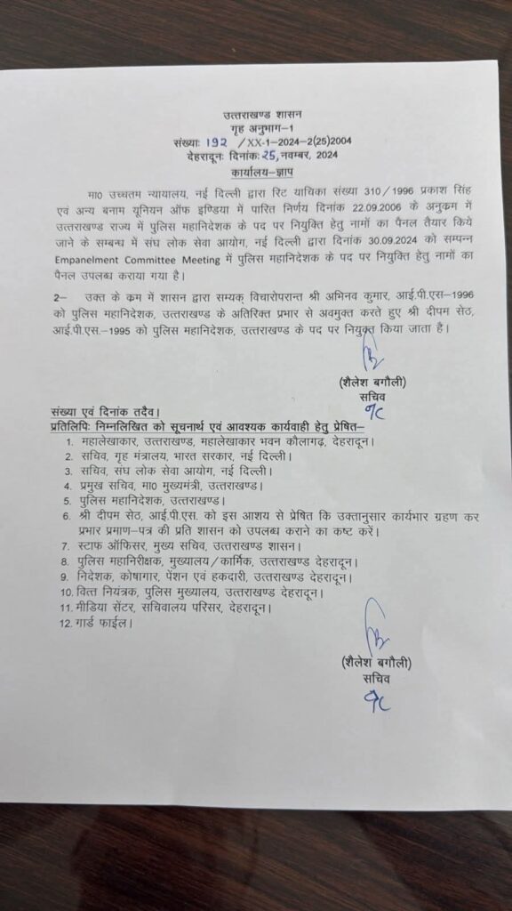 आज जारी आदेश में कहा गया कि अभिनव कुमार, आई.पी.एस-1996 को पुलिस महानिदेशक, उत्तराखण्ड के अतिरिक्त प्रभार से अवमुक्त करते हुए दीपम सेठ, आई.पी.एस.-1995 को पुलिस महानिदेशक, उत्तराखण्ड के पद पर नियुक्त किया जाता है।