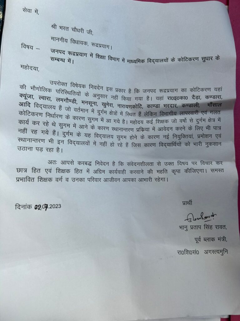 माध्यमिक विद्यालयों में कोटिकरण विसंगति को लेकर पूर्व ब्लॉक मंत्री रावत ने दिया रुद्रप्रयाग जनपद के विधायकों को ज्ञापन
