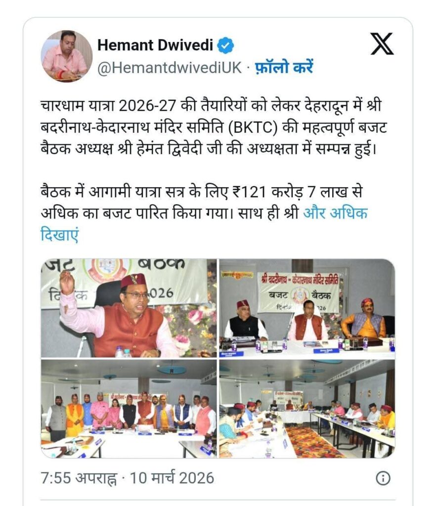 उत्तराखंड की विश्वप्रसिद्ध चारधाम यात्रा 2026 का शुभारंभ 19 अप्रैल से होने जा रहा है। इसी दिन गंगोत्री और यमुनोत्री धाम के कपाट खुलेंगे। यात्रा को देखते हुए शासन-प्रशासन तैयारियों में जुटा हुआ है और श्रद्धालुओं के पंजीकरण की प्रक्रिया 6 मार्च से शुरू हो चुकी है। इसी बीच बदरी-केदार मंदिर समिति (बीकेटीसी) ने एक बड़ा निर्णय लेते हुए बदरीनाथ और केदारनाथ धाम समेत अपने अधीन आने वाले 47 मंदिरों में गैर-सनातनियों के प्रवेश पर प्रतिबंध लगाने का प्रस्ताव पारित कर दिया है।देहरादून स्थित बीकेटीसी के शिविर कार्यालय में समिति के अध्यक्ष हेमंत द्विवेदी की अध्यक्षता में बजट बैठक आयोजित की गई। बैठक में वित्तीय वर्ष 2026-27 के लिए 121.7 करोड़ रुपये का बजट पारित किया गया। इसी बैठक में एक महत्वपूर्ण प्रस्ताव पर मुहर लगाते हुए बदरीनाथ और केदारनाथ धाम सहित समिति के अधीन 47 मंदिरों में गैर-सनातनियों के प्रवेश को प्रतिबंधित करने का निर्णय लिया गया।बीकेटीसी अध्यक्ष हेमंत द्विवेदी ने कहा कि लंबे समय से धामों की पवित्रता बनाए रखने के लिए इस तरह की मांग उठ रही थी। उन्होंने कहा कि जो लोग सनातन धर्म में आस्था रखते हैं और बाबा केदारनाथ तथा बदरी विशाल में श्रद्धा रखते हैं, उनका स्वागत है, लेकिन जो सनातन धर्म को नहीं मानते उनका मंदिर परिसर और गर्भगृह में प्रवेश वर्जित रहेगा।समिति के अनुसार यह प्रतिबंध केवल मंदिर परिसर और गर्भगृह तक सीमित रहेगा। धामों तक पहुंचने के लिए डोली, कंडी, घोड़े-खच्चर जैसी सेवाओं में लगे गैर-हिंदू लोगों के रोजगार पर इसका असर नहीं पड़ेगा। वे मंदिर परिसर के बाहर तक अपनी सेवाएं दे सकेंगे।