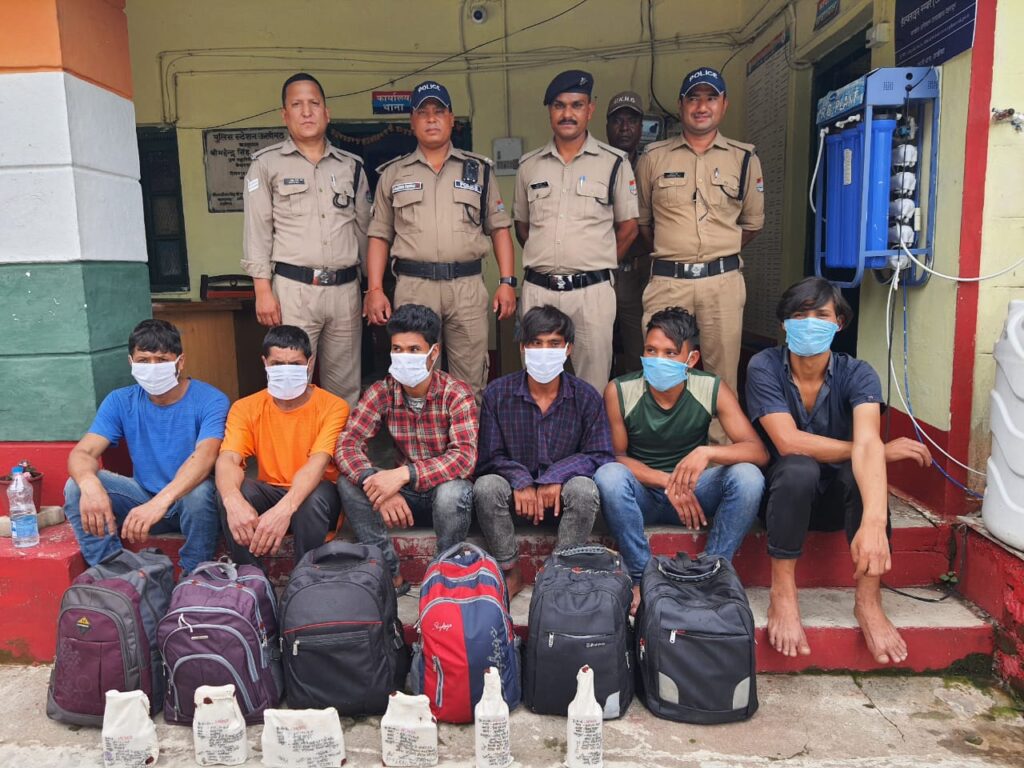 रुद्रप्रयाग-पुलिस उपाधीक्षक,ऑपरेशन्स के पर्यवेक्षण में थाना ऊखीमठ पुलिस द्वारा थाना ऊखीमठ क्षेत्रान्तर्गत स्थित भीरी, काकड़ागाड़, कुण्ड व चोपता क्षेत्रान्तर्गत निरन्तर चेकिंग की जा रही है। चेकिंग के दौरान 06 नेपाली मूल के व्यक्तियों के कब्जे से अलग-अलग मात्राओं में 52 पव्वे एवं 52 अद्धे सोलमेट व्हिस्की, 28 बोतल एवं 26 अद्धे मैक्डॉवल नम्बर 1 व्हिस्की (कुल मात्रा बोतल के अनुसार 78 बोतल)अवैध शराब की बरामदगी हुई। इनके द्वारा यह शराब अपने-अपने पिट्ठू बैगों में ले जायी जा रही थी।