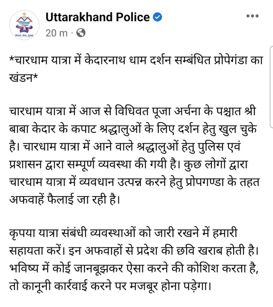 रुद्रप्रयाग-चारधाम यात्रा में विधिवत पूजा अर्चना के पश्चात श्री बाबा केदार के कपाट श्रद्धालुओं के लिए दर्शन हेतु खुल चुके है। चारधाम यात्रा में आने वाले श्रद्धालुओं हेतु पुलिस एवं प्रशासन द्वारा सम्पूर्ण व्यवस्था की गयी है। कुछ लोगों द्वारा चारधाम यात्रा में व्यवधान उत्पन्न करने हेतु प्रोपगण्डा के तहत अफवाहें फैलाई जा रही है।