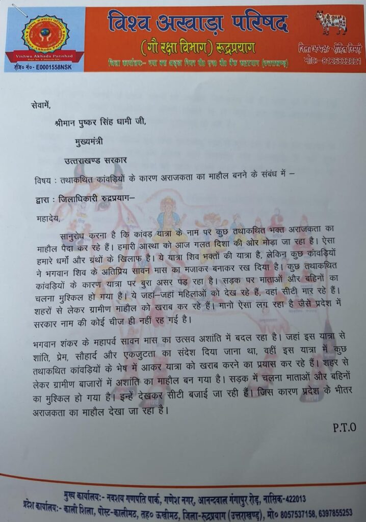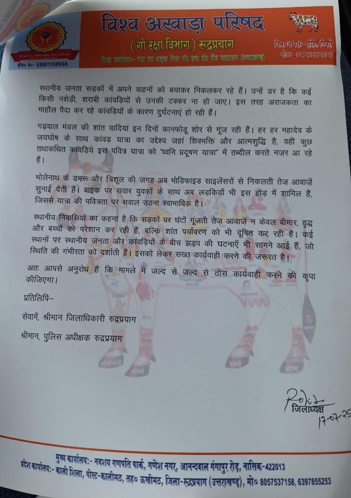 उन्होंने कहा कि शिवभक्ति का स्वरूप संयम, साधना और आत्मनियंत्रण से जुड़ा है, न कि तेज़ साउंड और उन्मादी प्रदर्शन से। कांवड़ यात्रा की गरिमा बनी रहे, इसके लिए प्रशासन और समाज दोनों को मिलकर सजग रहना होगा। इनकी जांच होनी जरूरी है। कांवड़ियों के भेष में अन्य समुदाय के लोग भी साधु-संत बनकर ठगी कर रहे हैं। उन्होंने कहा कि मामले में कार्यवाही को लेकर जिलाधिकारी रुद्रप्रयाग के माध्यम से मुख्यमंत्री पुष्कर सिंह धामी को ज्ञापन भेजा गया है और जल्द से जल्द ठोस कार्यवाही की मांग की गई है।