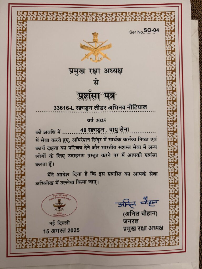 उत्तरकाशी के स्क्वाड्रन लीडर अभिनव नौटियाल को ‘ऑपरेशन सिंदूर’ में उत्कृष्ट सेवा पर सीडीएस सम्मान