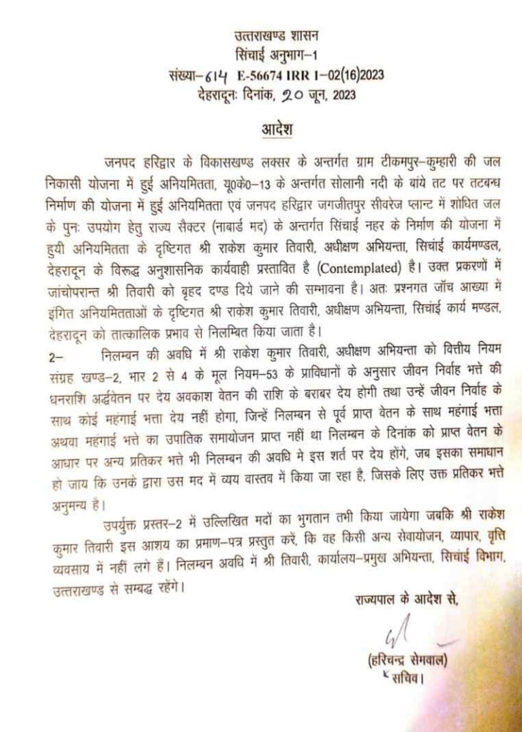 उक्त प्रकरणों में जांचोपरान्त तिवारी को बृहद दण्ड दिये जाने की सम्भावना है। अतः प्रश्नगत जाँच आख्या में इंगित अनियमितताओं के दृष्टिगत राकेश कुमार तिवारी, अधीक्षण अभियन्ता, सिचाई कार्य मण्डल, देहरादून को तात्कालिक प्रभाव से निलम्बित किया जाता है।2- निलम्बन की अवधि में राकेश कुमार तिवारी, अधीक्षण अभियन्ता को वित्तीय नियम संग्रह खण्ड – 2 भार 2 से 4 के मूल नियम 53 के प्राविधानों के अनुसार जीवन निर्वाह भत्ते की धनराशि अर्द्धवेतन पर देय अवकाश वेतन की राशि के बराबर देय होगी तथा उन्हें जीवन निर्वाह के साथ कोई महंगाई भत्ता देय नहीं होगा, जिन्हें निलम्बन से पूर्व प्राप्त वेतन के साथ महंगाई भत्ता अथवा महंगाई भत्ते का उपातिक समायोजन प्राप्त नहीं था निलम्बन के दिनांक को प्राप्त वेतन के आधार पर अन्य प्रतिकर भत्ते भी निलम्बन की अवधि मे इस शर्त पर देय होंगे, जब इसका समाधान हो जाय कि उनके द्वारा उस मद में व्यय वास्तव में किया जा रहा है, जिसके लिए उक्त प्रतिकर भत्ते अनुमन्य है।