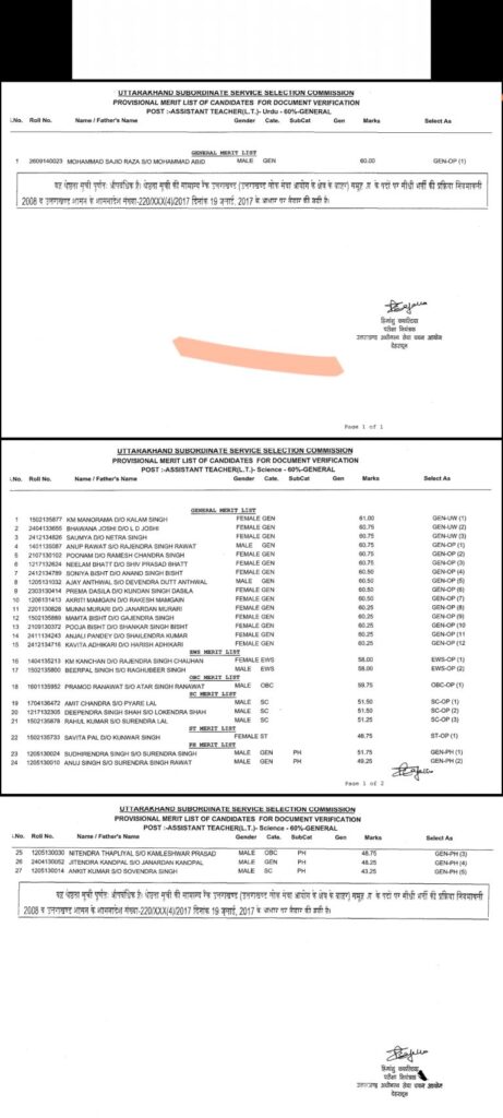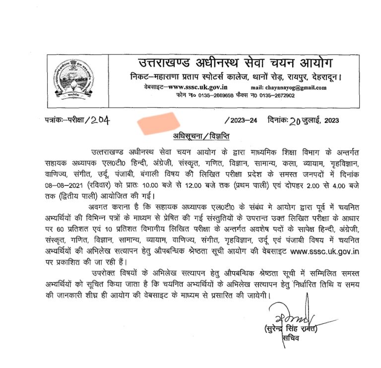अवगत कराना है कि सहायक अध्यापक एल०टी० के संबंध मे आयोग द्वारा पूर्व में चयनित अभ्यर्थियों की विभिन्न पत्रों के माध्यम से प्रेषित की गई संस्तुतियों के उपरान्त उक्त लिखित परीक्षा के आधार पर 60 प्रतिशत एवं 10 प्रतिशत विभागीय लिखित परीक्षा के अन्तर्गत अवशेष पदों के सापेक्ष हिन्दी, अंग्रेजी, संस्कृत, गणित, विज्ञान, सामान्य, व्यायाम, वाणिज्य, संगीत, गृहविज्ञान, उर्दू एवं पंजाबी विषय में चयनित अभ्यर्थियों की अभिलेख सत्यापन हेतु औपबन्धिक श्रेष्ठता सूची आयोग की वेबसाइट www.sssc.uk.gov.in पर प्रकाशित की जा रही हैं।उपरोक्त विषयों के अभिलेख सत्यापन हेतु औपबन्धिक श्रेष्ठता सूची में सम्मिलित समस्त अभ्यर्थियों को सूचित किया जाता है कि चयनित अभ्यर्थियों के अभिलेख सत्यापन हेतु निर्धारित तिथि व समय की जानकारी शीघ्र ही आयोग की वेबसाइट के माध्यम से प्रसारित की जायेगी।
